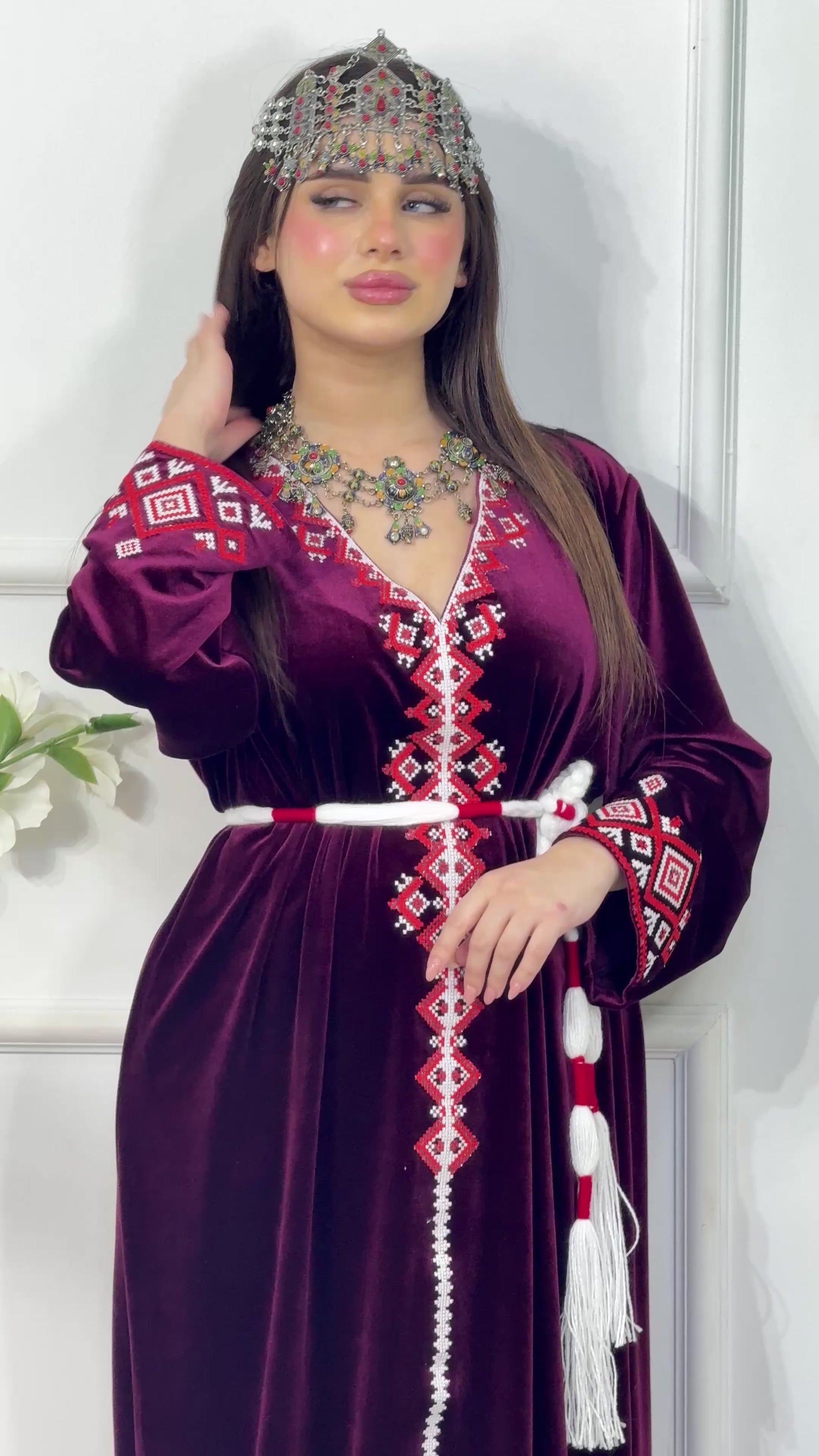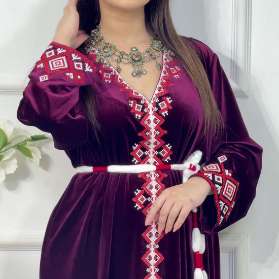 فستان مخملي ناعم ودافئ، مطرز بتطريز الغرز المتقاطعة بربري. مريح وأنيق، مثالي لفصل الشتاء.