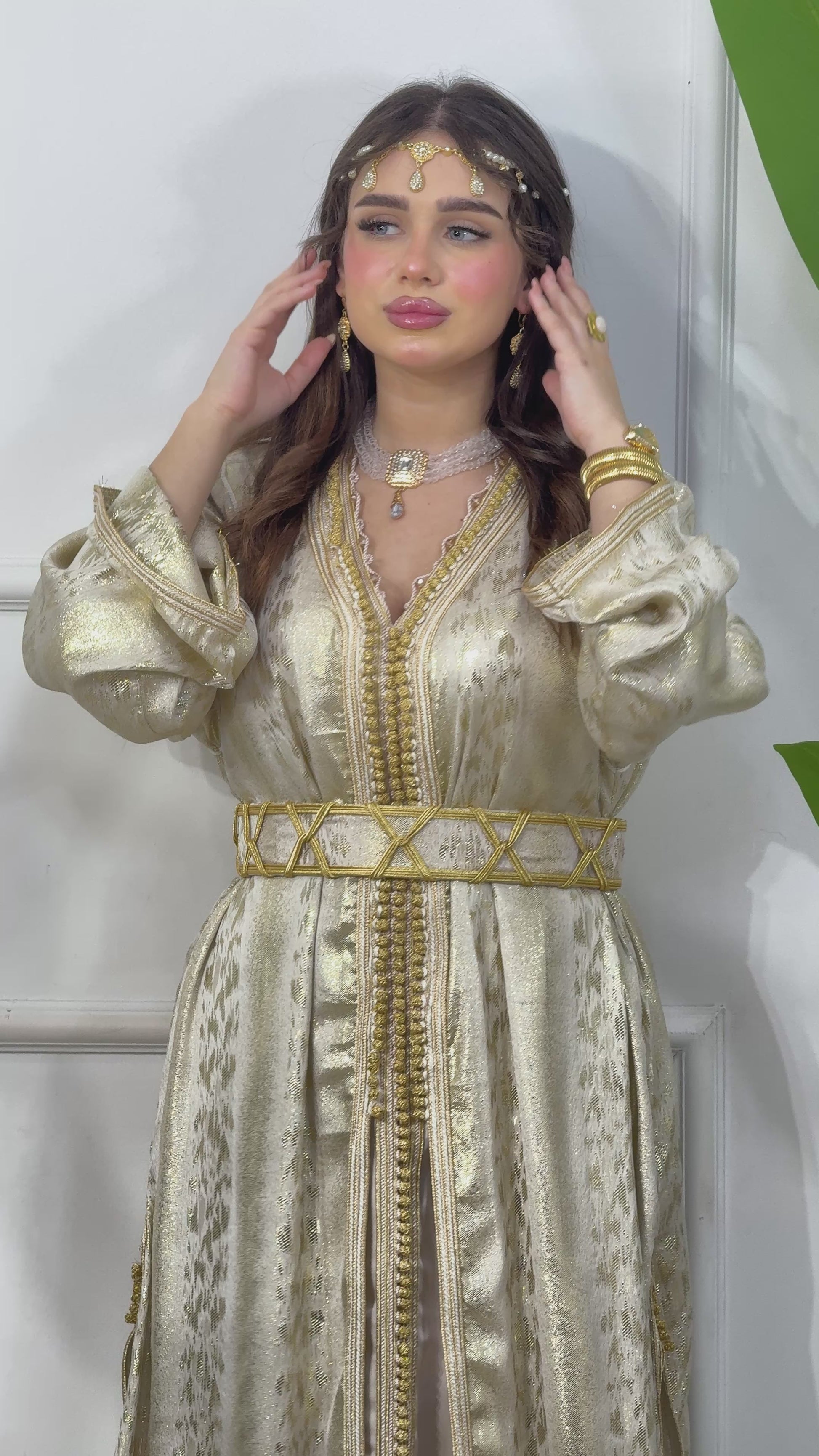 Découvrez le Caftan Amira, un modèle deux pièces alliant raffinement et élégance. Le haut est confectionné en tissu Tlija (ثليجة), reconnu pour son éclat et son aspect traditionnel luxueux.